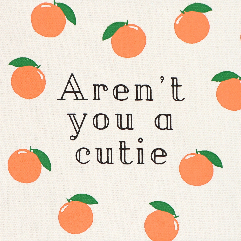 "Aren't You A Cutie" written in black on a white background with a 'cutie' orange pattern. I mean first of all, you're a cutie. But the pun! We love a good pun. The pouch is white with an orange cutie design and the text says “Aren't You A Cutie” in black lettering. These pouches measure approximately 9.5” x 7”. A great size for a pencil pouch, cosmetic pouch, or just to carry all those extra bits and pieces you need to help organize your life!