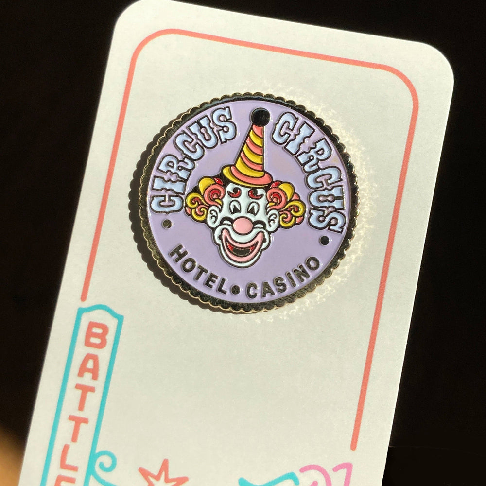 Capture the glittering magic of old-school Las Vegas with this charming pin, designed as an homage to the iconic Circus Circus manor sign. Measuring 1.25" wide, this collectible enamel pin brings vintage Vegas energy to your jacket, backpack, or pinboard with bold color, playful detail, and a whole lot of personality. Whether you’re a lover of classic neon signs or just someone who knows the thrill of a late-night circus-themed buffet, this pin is the perfect accessory to show your love for a legendary piece of Vegas history.