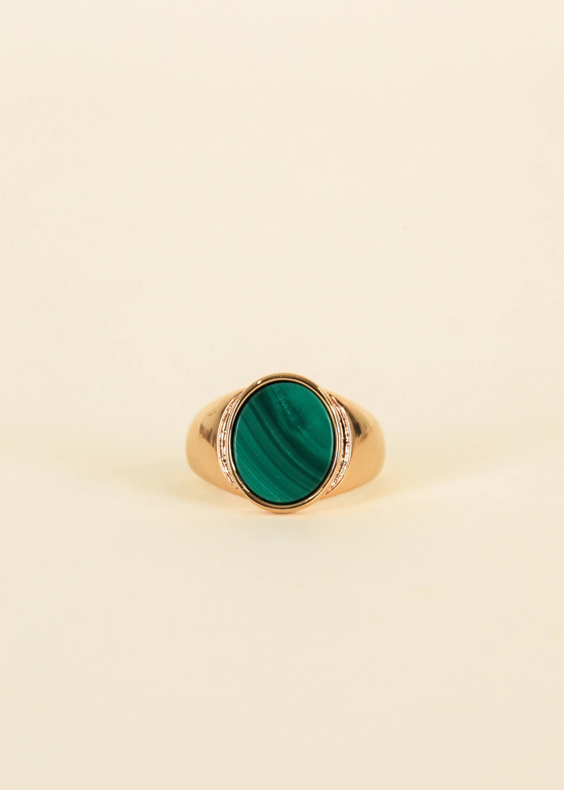 A new take on our ever-popular signet ring, the Malachite ring is made from a substantial oval of Malachite stone with a graduating width band of gold. Malachite is known as the "growth" stone used to support emotional transformation and de-stress during the ebb and flow of the tides. Natural stones will show variation in tones and color. Tarnish Free - Long lasting protective coating safeguarding your jewelry from sweat, water, and more. 5x more gold that standard 18k gold plating over brass Hypoallergenic – Lead Free Genuine Malachite stone Band width approx. 1.5mm at thinnest, 14mm at widest Setting approx. 10mm Sizes 6, 7, 8