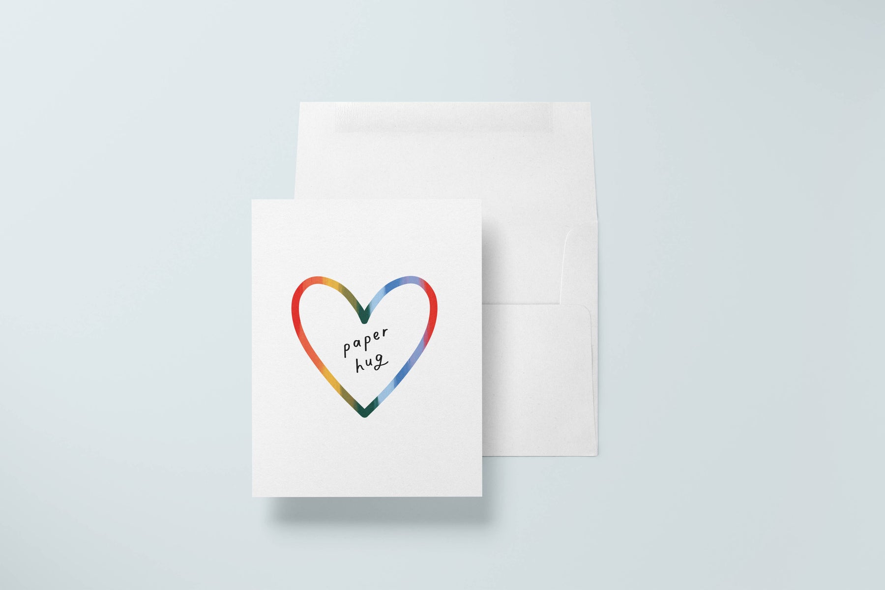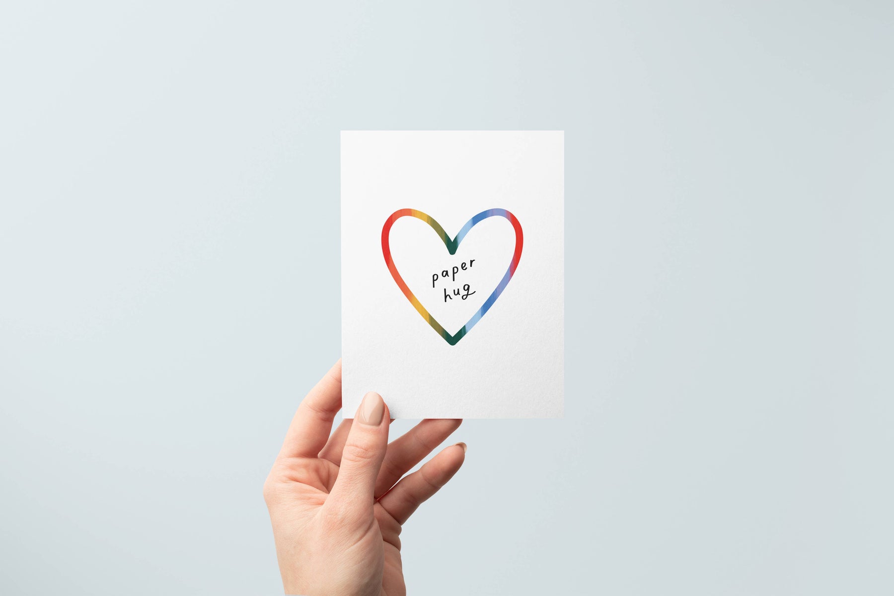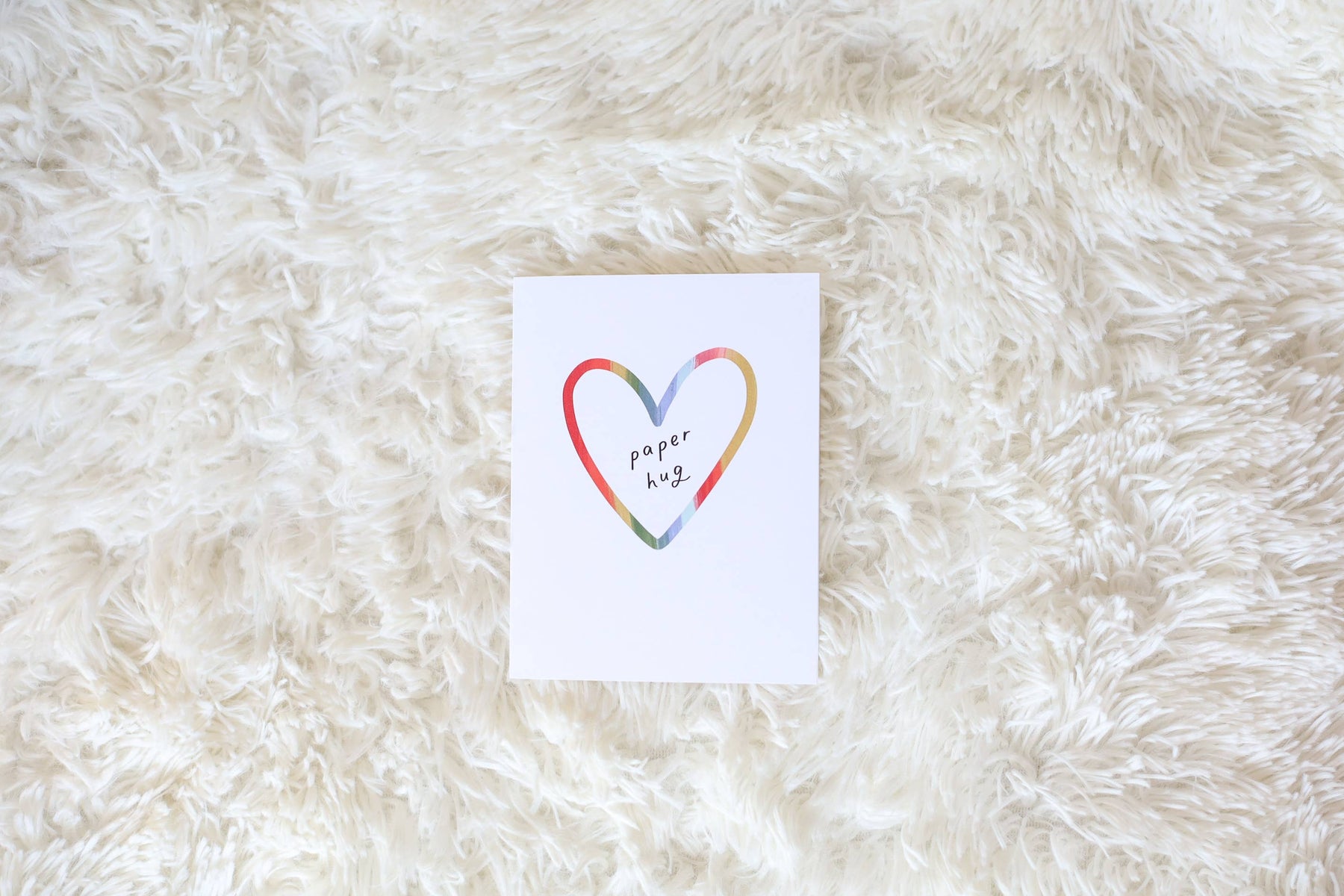 Paper Hug Card. A2 size (4.25” x 5.5”). Folded greeting card, blank inside. Professionally printed on white card stock. Cello sleeve and envelope included. Hand lettered + designed in Michigan, printed in USA. Greeting Card Uses: Sympathy Cards, Rainbow Cards, Encouragement Card, Rainbow Heart, Supportive Gifts, Cards For Her, Long Distance Cards, Everyday Cards, Blank Card, Cards For Friend.