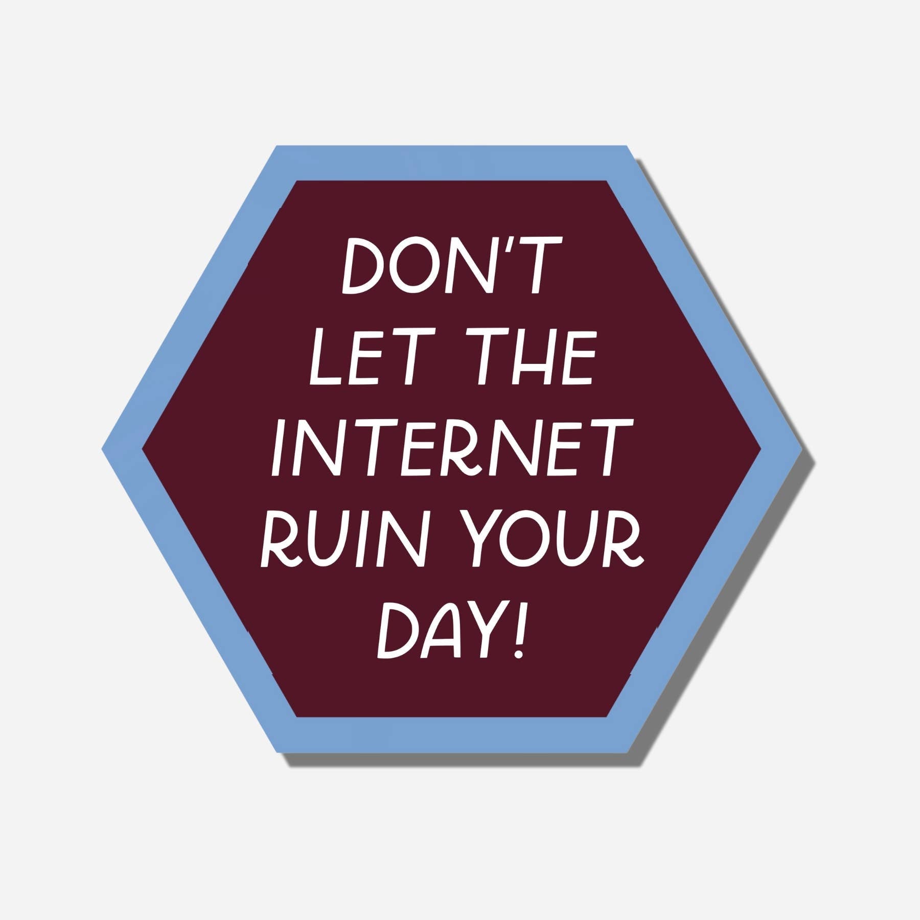 Don't Let The Internet Ruin Your Day Sticker. Waterproof matte sticker measures 2.5 inches. Hand lettered + designed in Michigan, professionally printed in USA. Water-resistant high quality sticker. Maroon background with white lettering and light blue border. Die-cut geometric shape sticker. Sticker Uses: 2025 Gifts, Positive Quote, On-Trend Gifts, Burgundy, Vinyl Stickers, Rainbow Stickers, Water Bottle Stickers, Laptop Stickers, Weatherproof Stickers, Stickers With Words, High Quality Stickers, Durable Stickers, Screen Time Stickers, Self-Care Stickers, Intentional Gifts, Colorful Lettering.