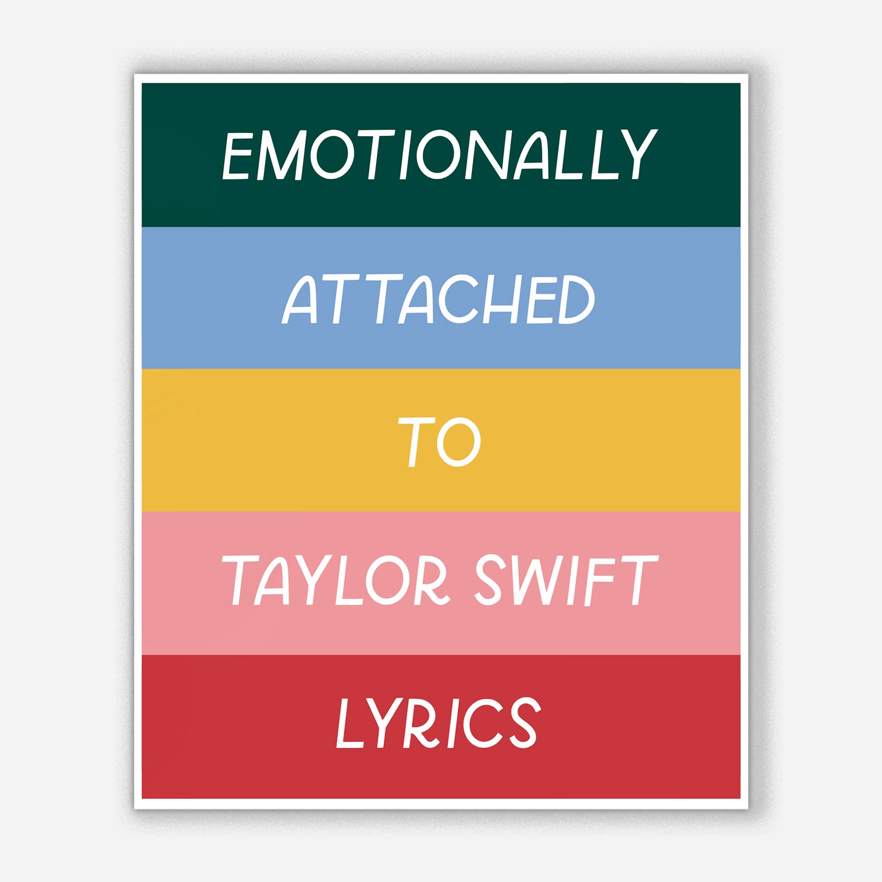 Emotionally Attached To Taylor Lyrics Vinyl Sticker. Durable sticker measures 3 inches. Hand lettered + designed in Michigan, professionally printed in USA. Water-resistant high quality sticker. Sticker Uses + Tags: Waterproof Stickers, Tay Stickers, Christmas 2025, Stocking Stuffers, Eras Inspired, TS12, Colorful Stripes, TS Stickers, Rainbow Stripe, Pop Culture Gifts, On-Trend, Eras Tour, Funny Stickers, Stickers With Words, Stickers For Water Bottle, Gifts for Her.