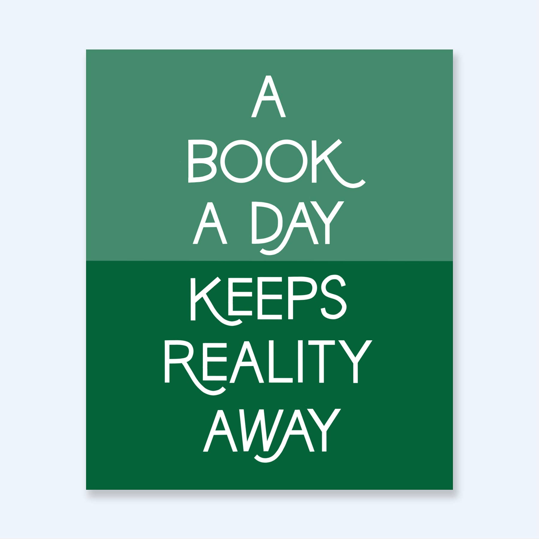 A Book A Day Keeps Reality Away Vinyl Sticker. Duotone green sticker with book quote in white lettering.