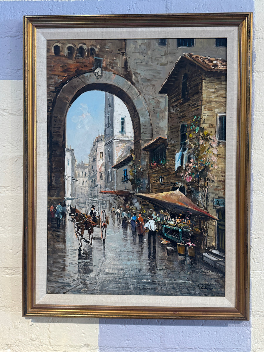 Vintage European Street Scene Oil Painting – Framed Wall Art