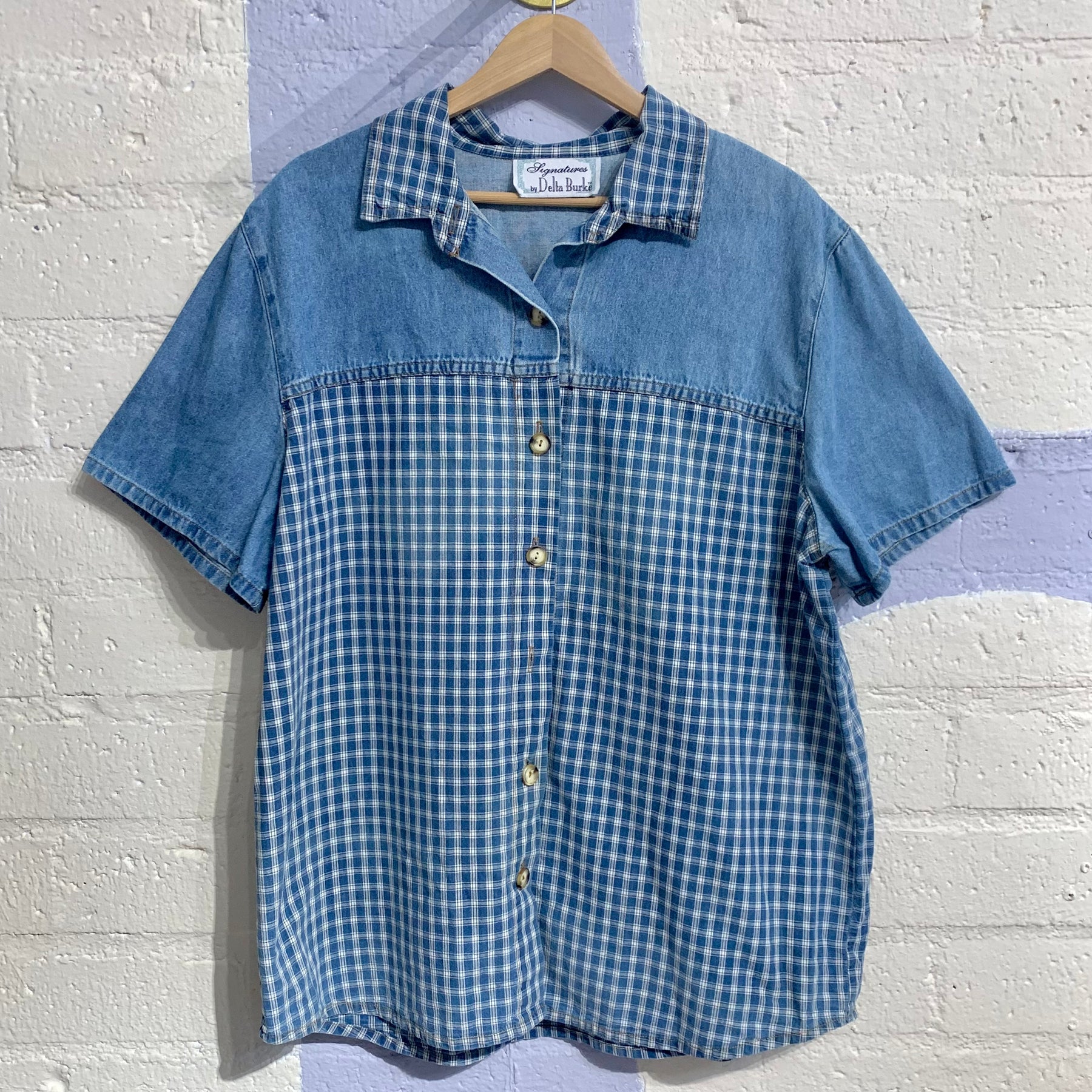 This vintage Delta Burke short sleeve button-down shirt blends casual denim with classic blue gingham for an easy, laid-back look with timeless appeal. The mix of fabrics adds visual interest, while the short sleeves keep it comfortable and wearable for warmer days.