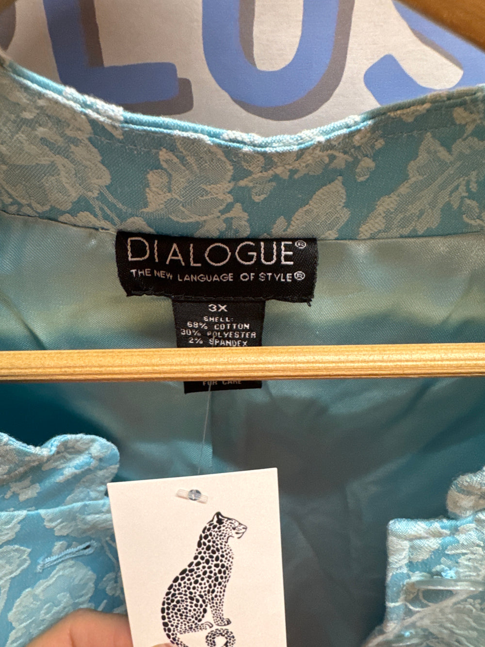 Make an entrance in this icy blue brocade blazer from Dialogue—a brand known in the late ’90s and early 2000s for bold, fashion-forward pieces with a luxe, structured feel. This jacket is giving “Y2K power suit meets tea party glam.”