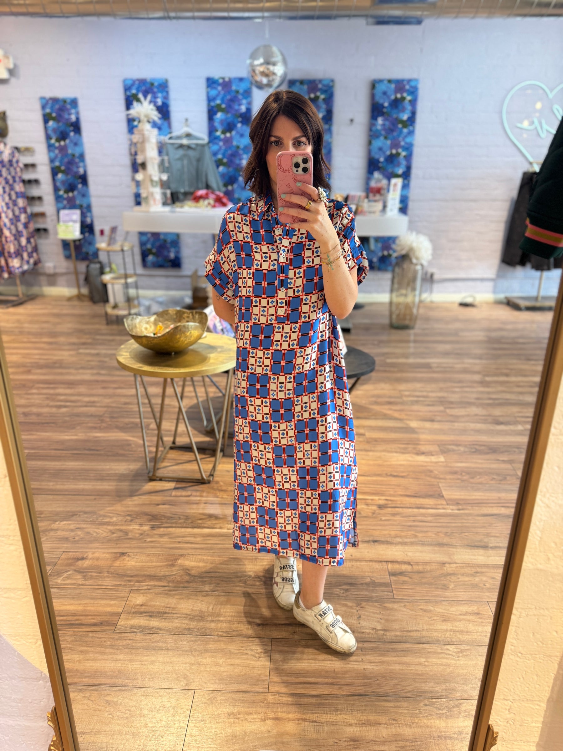 Bright, bold, and made for easy days. The Canopus shirt dress is that throw-on piece that instantly looks styled—with a playful geometric pattern in red, blue, and white that does all the work for you.