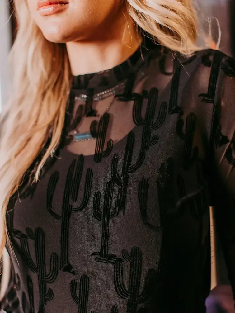 Make a statement with this sheer mesh long sleeve top, designed with bold velvet-flocked cactus detailing that adds instant texture and edge. Lightweight and breathable with just the right amount of stretch, this top layers effortlessly over bralettes or under slip dresses, jackets, and overalls.