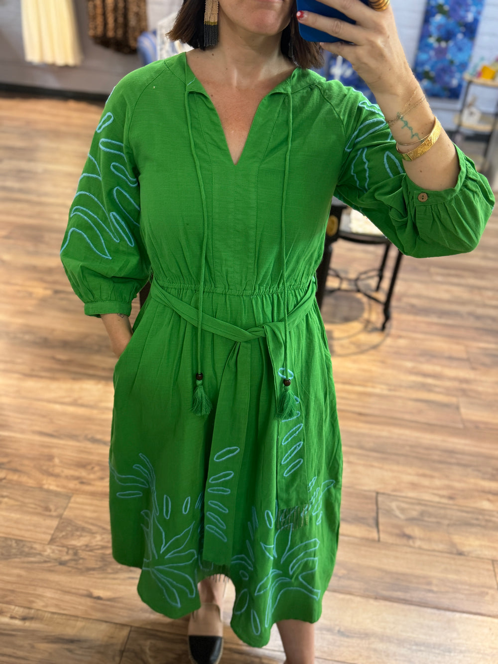 What makes this dress stand out isn’t just the gorgeous embroidery—it’s the cascade of thoughtful details woven throughout. The flattering split neck with adjustable ties gives you styling flexibility, whether you prefer an open neckline or a soft bow for a polished finish. Bracelet-length sleeves add a graceful touch and make this dress perfect for transitional weather. With a 48 ½” length (size Medium), the hem falls elegantly below the knee, creating a sophisticated A-line silhouette that moves with you. The removable tie belt cinches the waist just right, letting you choose between a structured fit or easy, breezy flow. To top it all off, front slant pockets blend practicality with charm, giving you space to tuck away small essentials. Every stitch of this dress is designed to make you feel comfortably chic.