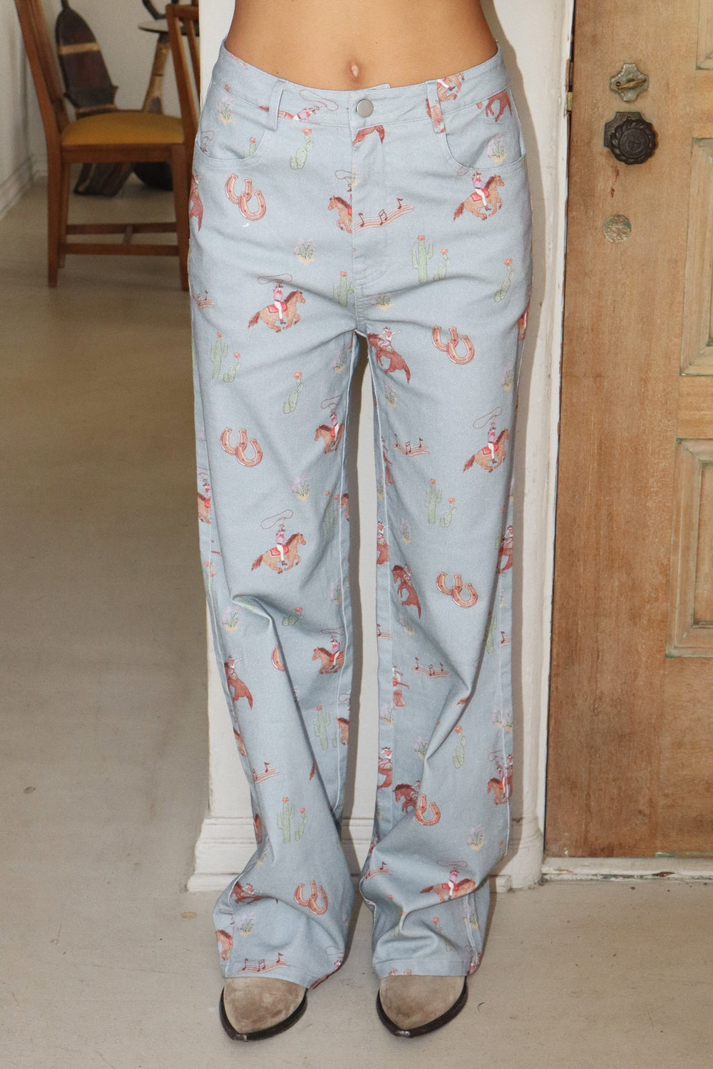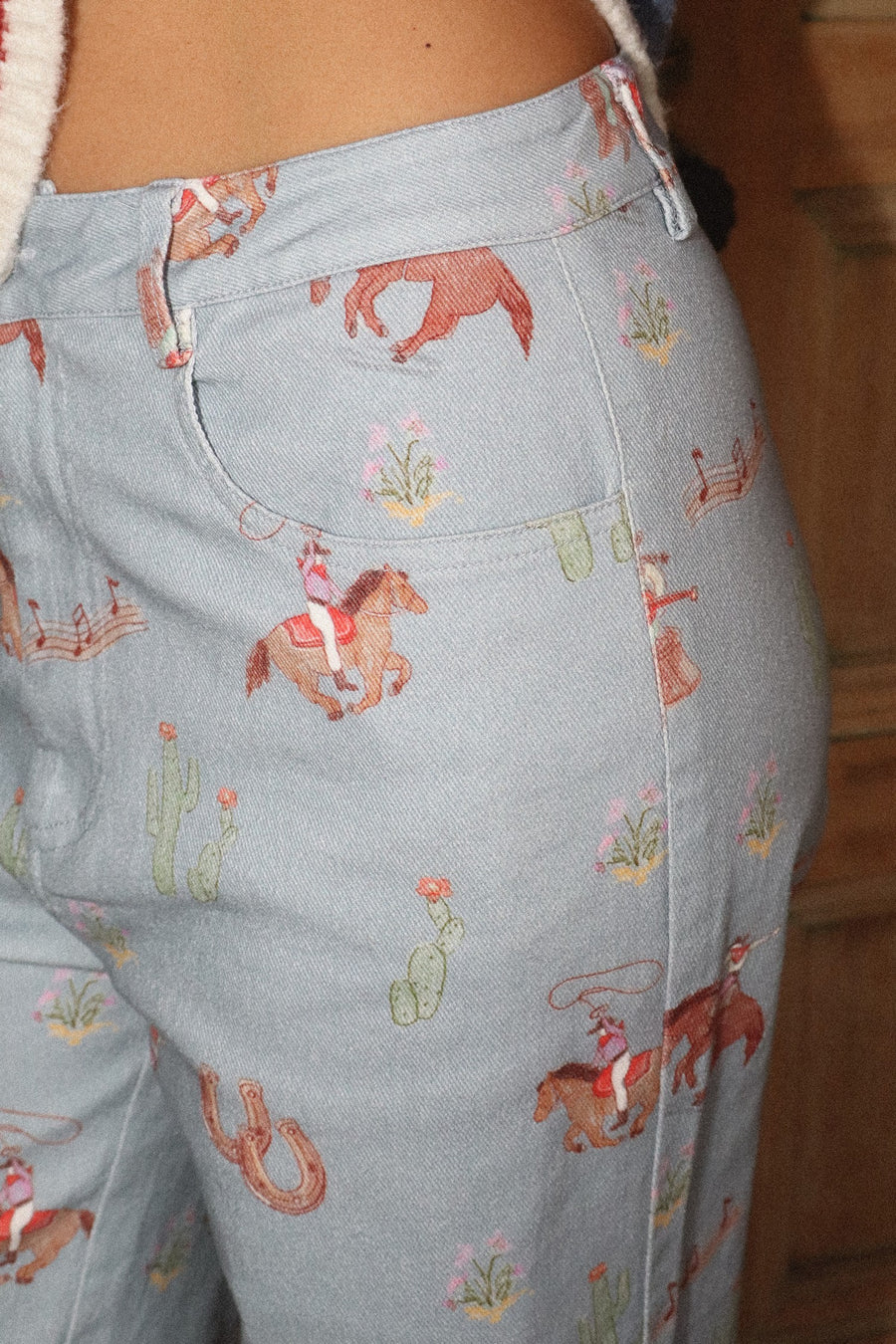 Channel your inner cowgirl with these Western-inspired print jeans, designed to bring bold personality and authentic rodeo flair to your everyday look. Featuring a standout cowgirl print, these jeans combine the rugged charm of Western style with the comfort and versatility of modern denim.
