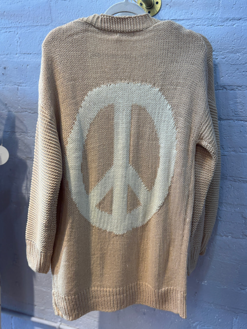 Get Ready To Spread Some Good Vibes With Our Knit Cardigan! Featuring A Large Peace Symbol On The Back, This Cardigan Is Perfect For Adding A Touch Of Style And Message To Your Outfit. With Its Loose, Long Fit And Textured Knit Pattern, It's As Comfy As It Is Cool. Pair It With A White Crop Top And High-waisted Jeans For A Look That's All About Peace And Love!