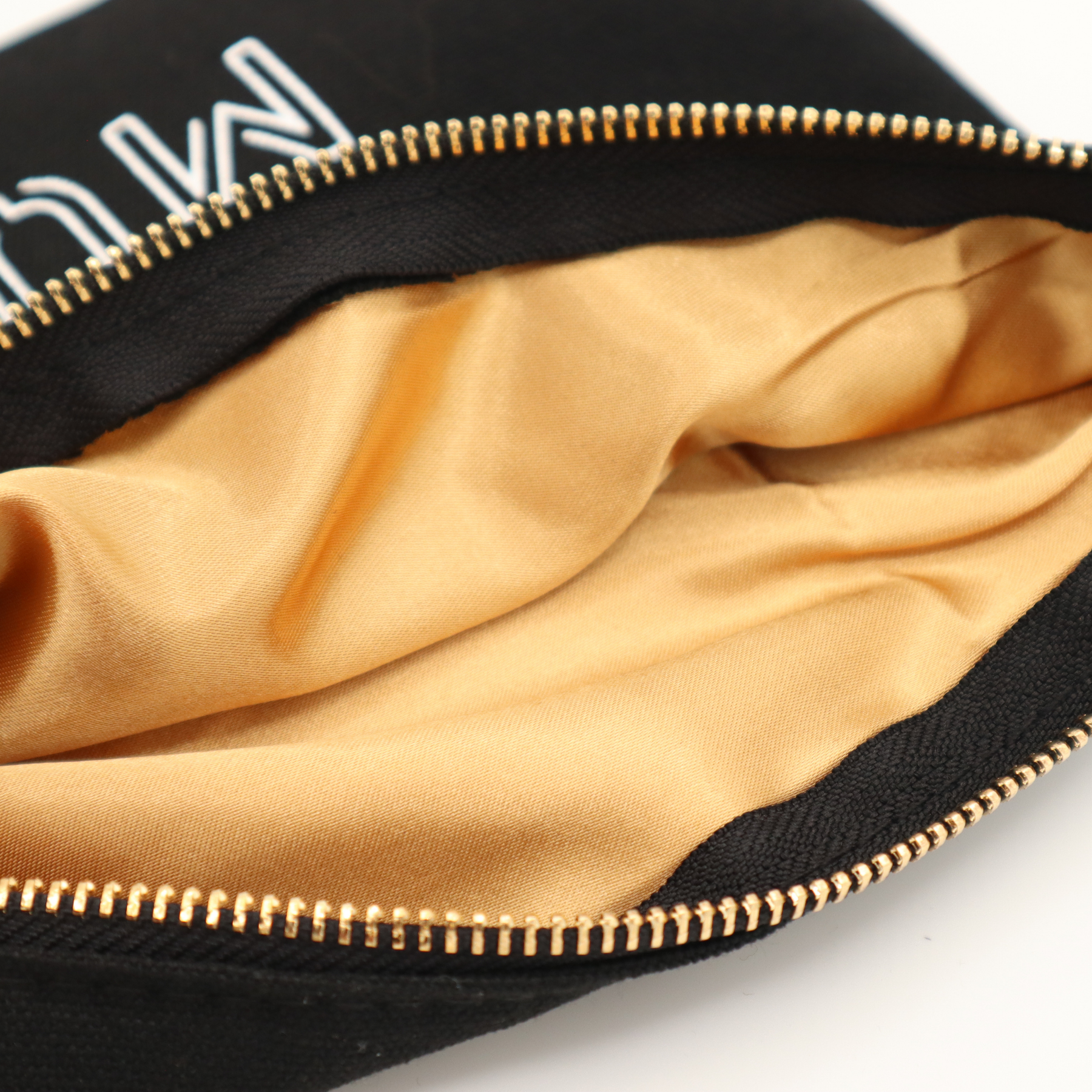 Designed to be as practical as it is expressive, this pouch features a durable canvas exterior and a gold satin lining inside for a fun pop of color that’s also easy to wipe clean. Finished with a secure zipper closure, it keeps all your essentials safely tucked away while making a statement every time you reach for it.