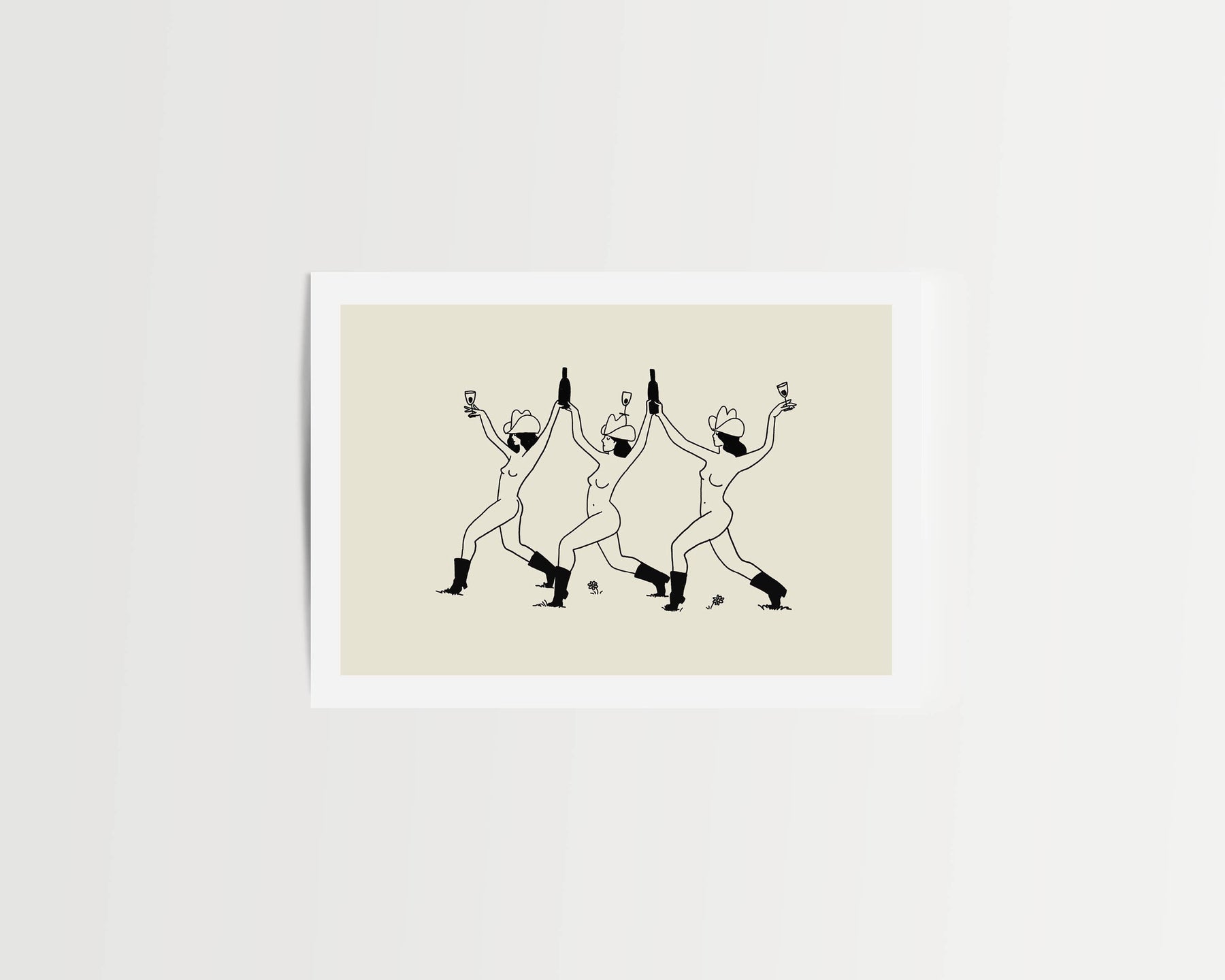 Give your customers a piece of art that celebrates friendship and good times! This unframed art print captures a delightful scene of three cowgirls sauntering through a field, ready to enjoy some wine. It's a fun, free-spirited piece of wall art that brings a touch of whimsy and camaraderie to any home decor collection. Ready for easy retail, each art print is individually packaged on high-quality 230 gsm, 12 mil fine art matte paper. It arrives with a rigid backing with logo for authenticity, sealed in a protective, recycled cellophane sleeve. Stock these in your shop in 5x7, 8x10, and 11x14 sizes. The larger 8x10 and 11x14 prints have a 1-inch border, and the 5x7 has a 1/2-inch border for a polished, ready-to-frame look.